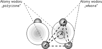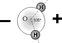 Cząsteczka wody o wzorze H2O jest zbudowana z jednego atomu tlenu i dwóch atomów wodoru. Ponieważ atom tlenu jest silnie elektroujemny, ładunek par elektronowych, wiążących atom tlenu z dwoma atomami wodoru, grupuje się w pobliżu jądra atomu tlenu. W pobliżu jąder wodorów (protonów) cząsteczka wody wykazuje więc wypadkowy ładunek dodatni, w pobliżu jądra tlenu - wypadkowy ładunek ujemny. Takie rozłożenie ładunków sprawia, że cząsteczka wody jest dipolem (rys.1).