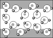 W ciekłym stanie skupienia cząsteczki wody poruszają się bezustannie i chaotycznie, ale "trzymają się" razem, gdyż przyciągają się wzajemnie i dzięki temu woda zachowuje spoistość, nie rozpada się samorzutnie. Rys.2. przedstawia model wody, choć nie oddaje on oczywiście nieustannego ruchu cząsteczek.