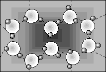 Takie ustawienie jest spowodowane tym, że atomy wodoru starają się być jak najbliżej atomu tlenu (występuje przyciąganie), a jednocześnie chcą być jak najdalej od siebie (odpychanie). Konsekwencją takiego łączenia się cząsteczek wody jest powstanie sieci krystalicznej o ażurowej strukturze (rys.4.), przypominającej tunele. A więc sieć krystaliczna lodu zawiera wiele pustych miejsc i właśnie one decydują o zmianie gęstości w czasie topnienia. Warto wspomnieć, że charakterystyczną symetrię sześciokątną ustawienia cząsteczek obserwujemy na zewnątrz w pojedynczych płatkach śniegu.